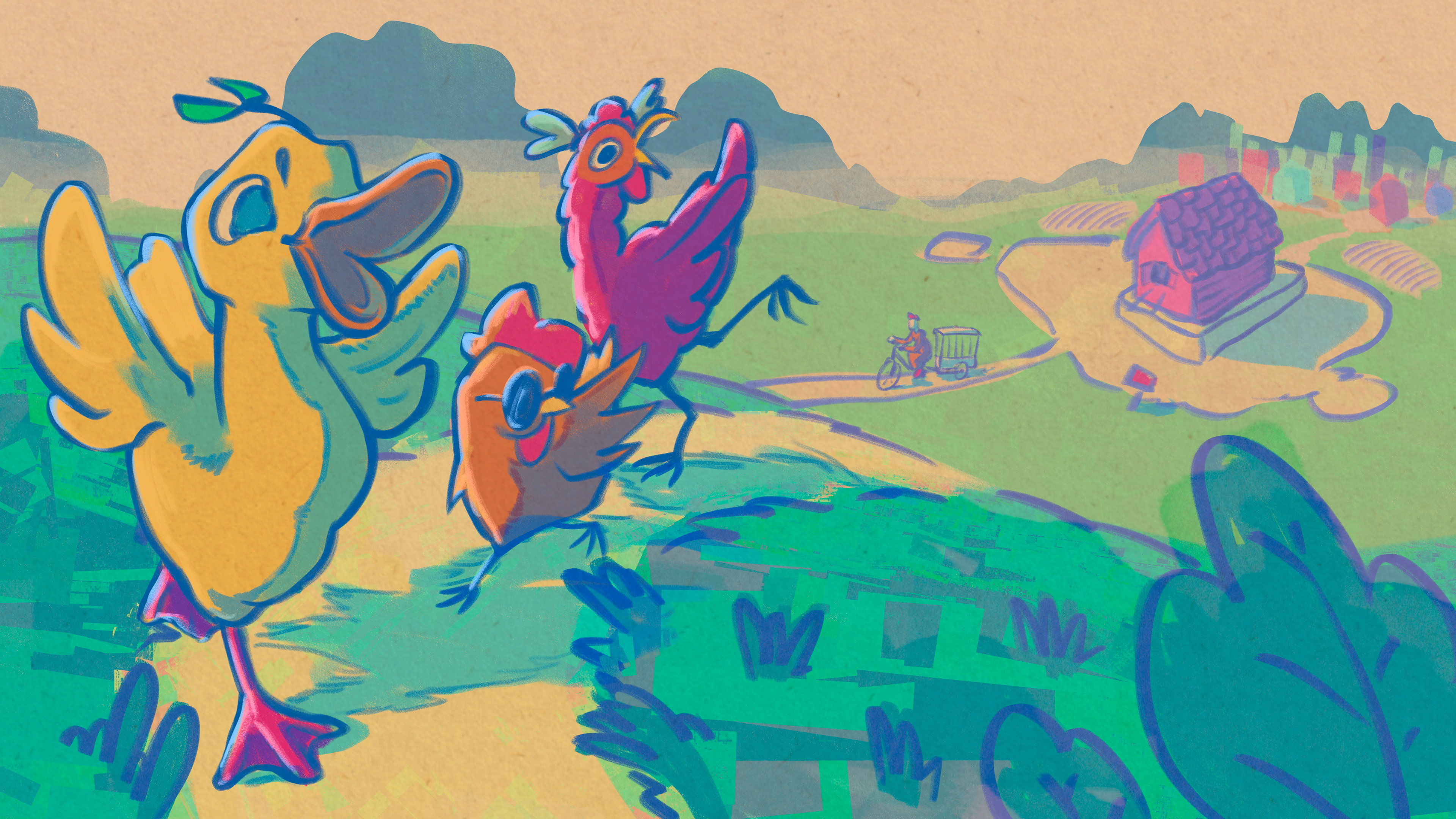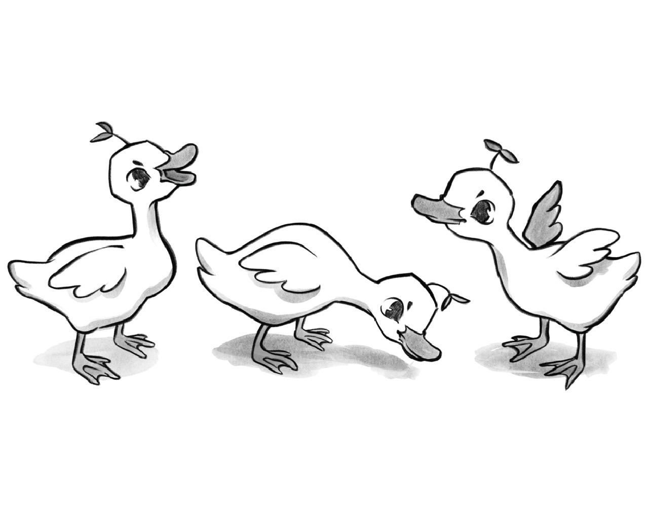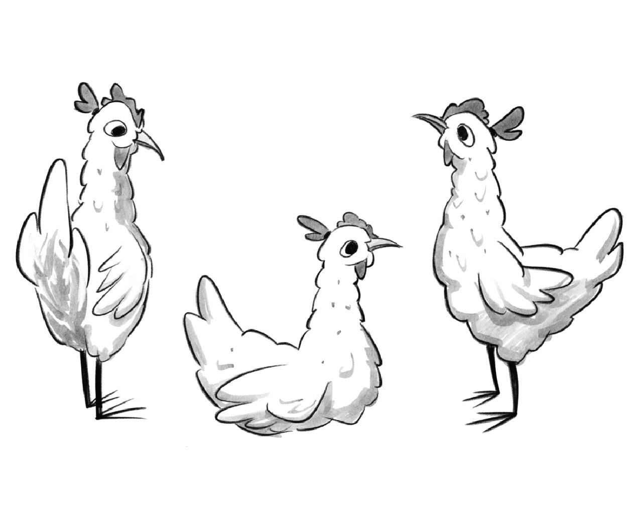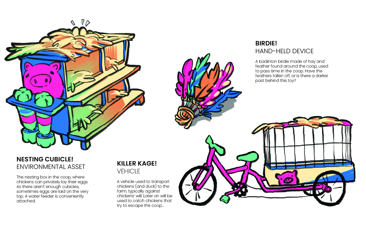 DUCK DASH is a children's book concept about a duck who grows up in a chicken coop, yearning for freedom. Despite being treated with familiarity by most chickens, the duck dreams of swimming in ponds and meeting others like itself. Together with the chickens, they plot an escape. This project focused on developing a believable, story-driven world through original character designs, props, and environments.