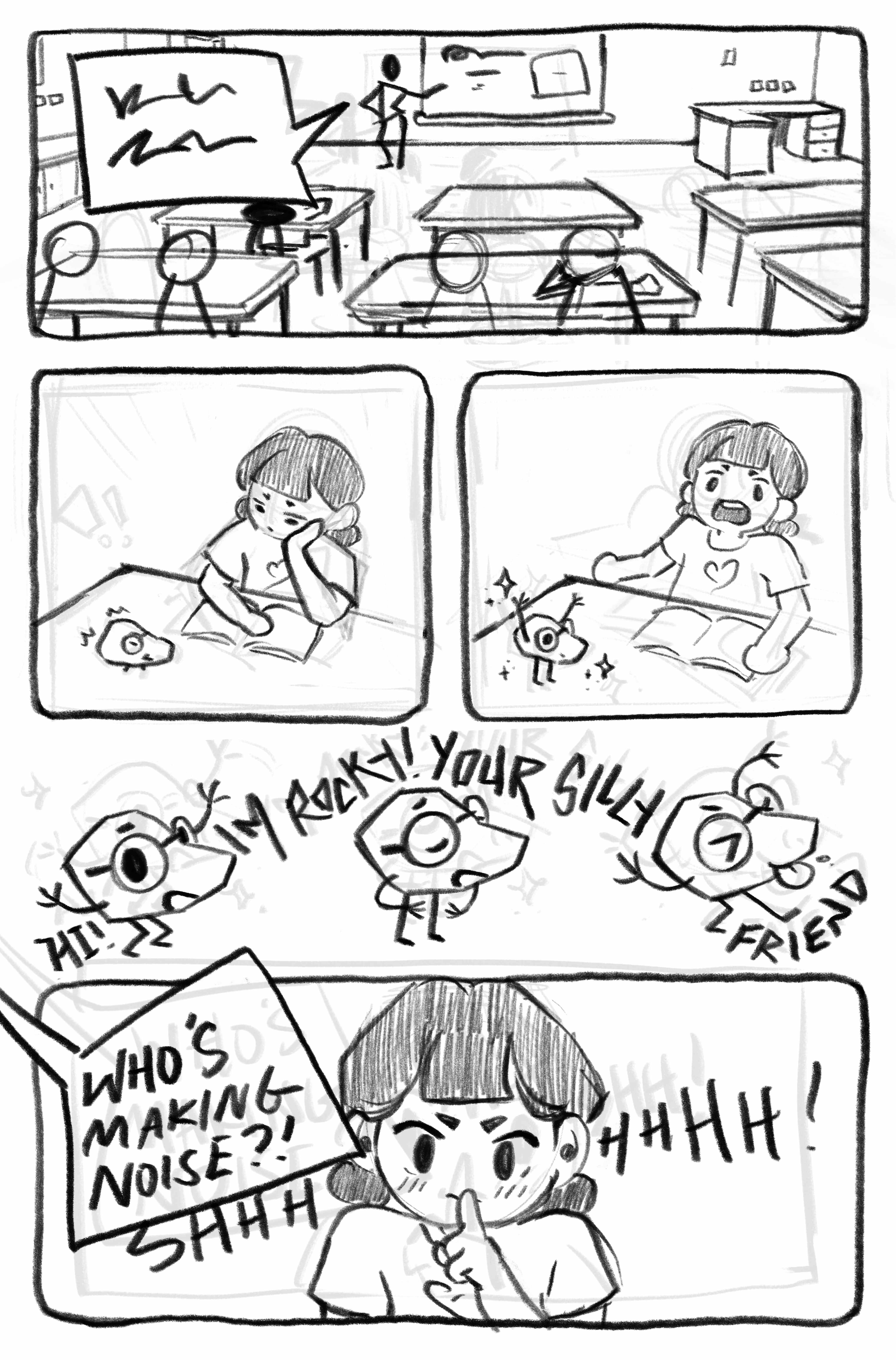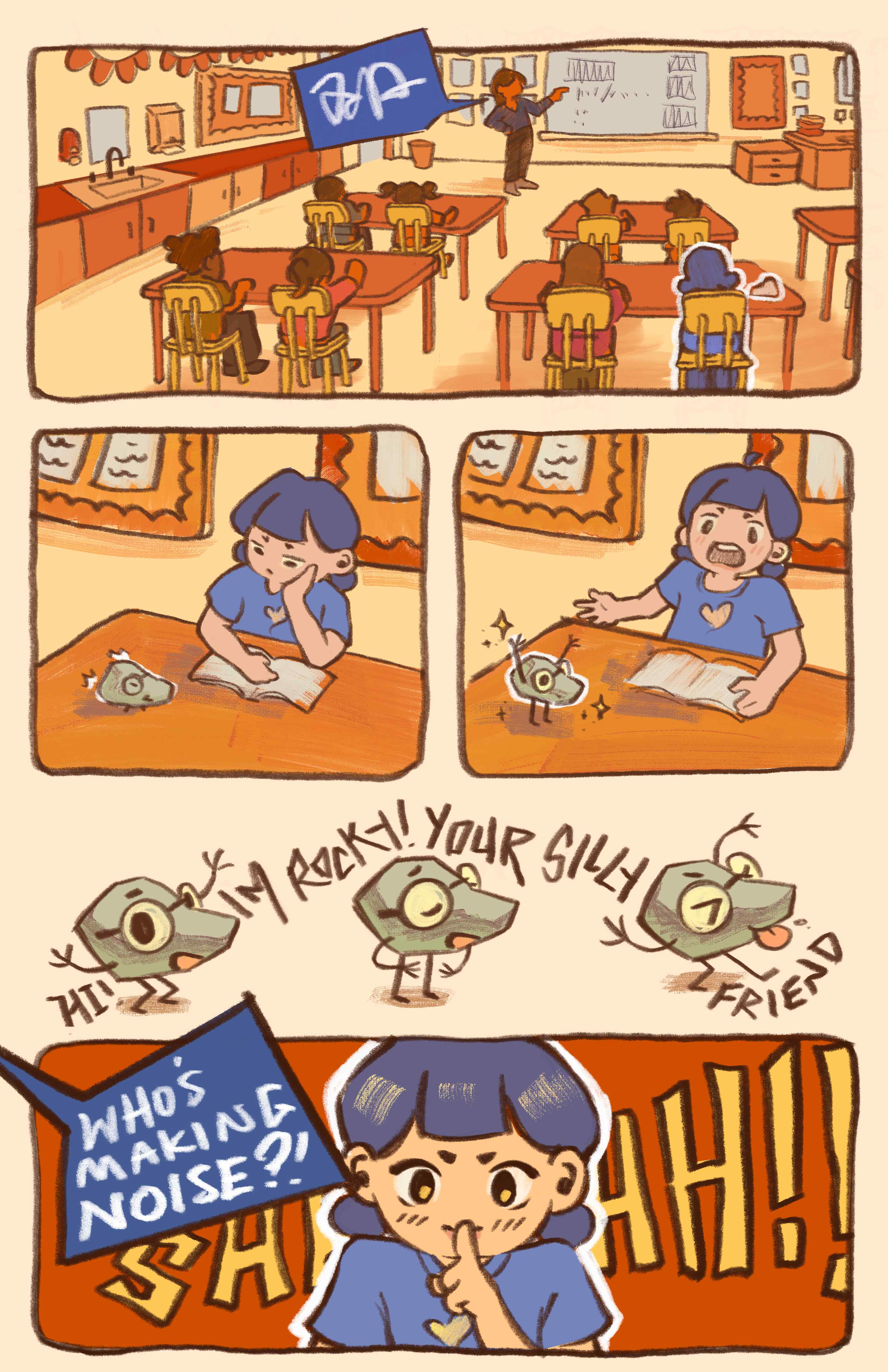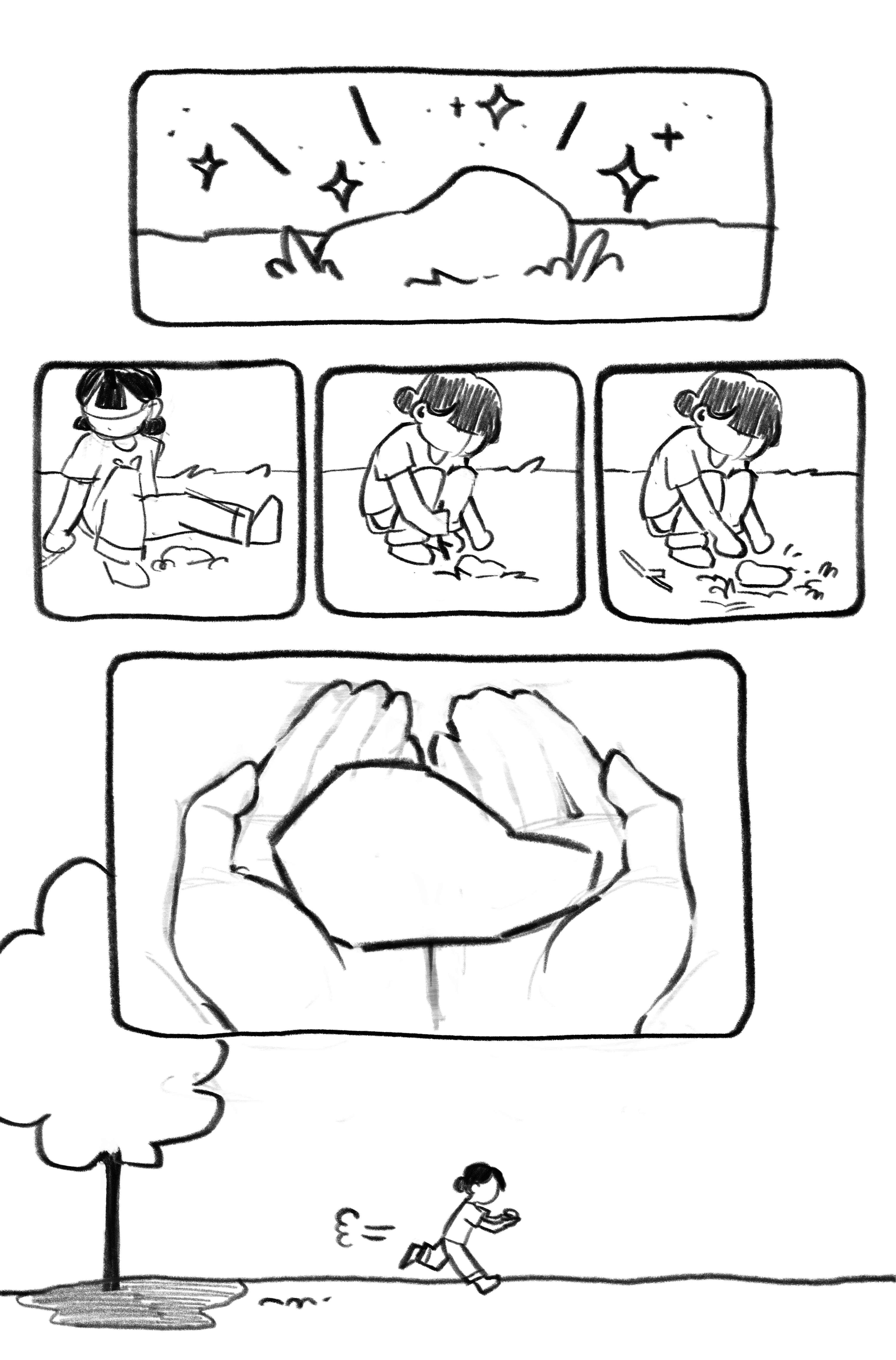 A six-page comic that brings childhood wonder to life. This story is based on a personal memory in elementary school, finding a rock and naming it Rocky. The comic exaggerates reality to capture the limitless imagination kids have, where an ordinary rock becomes something magical.