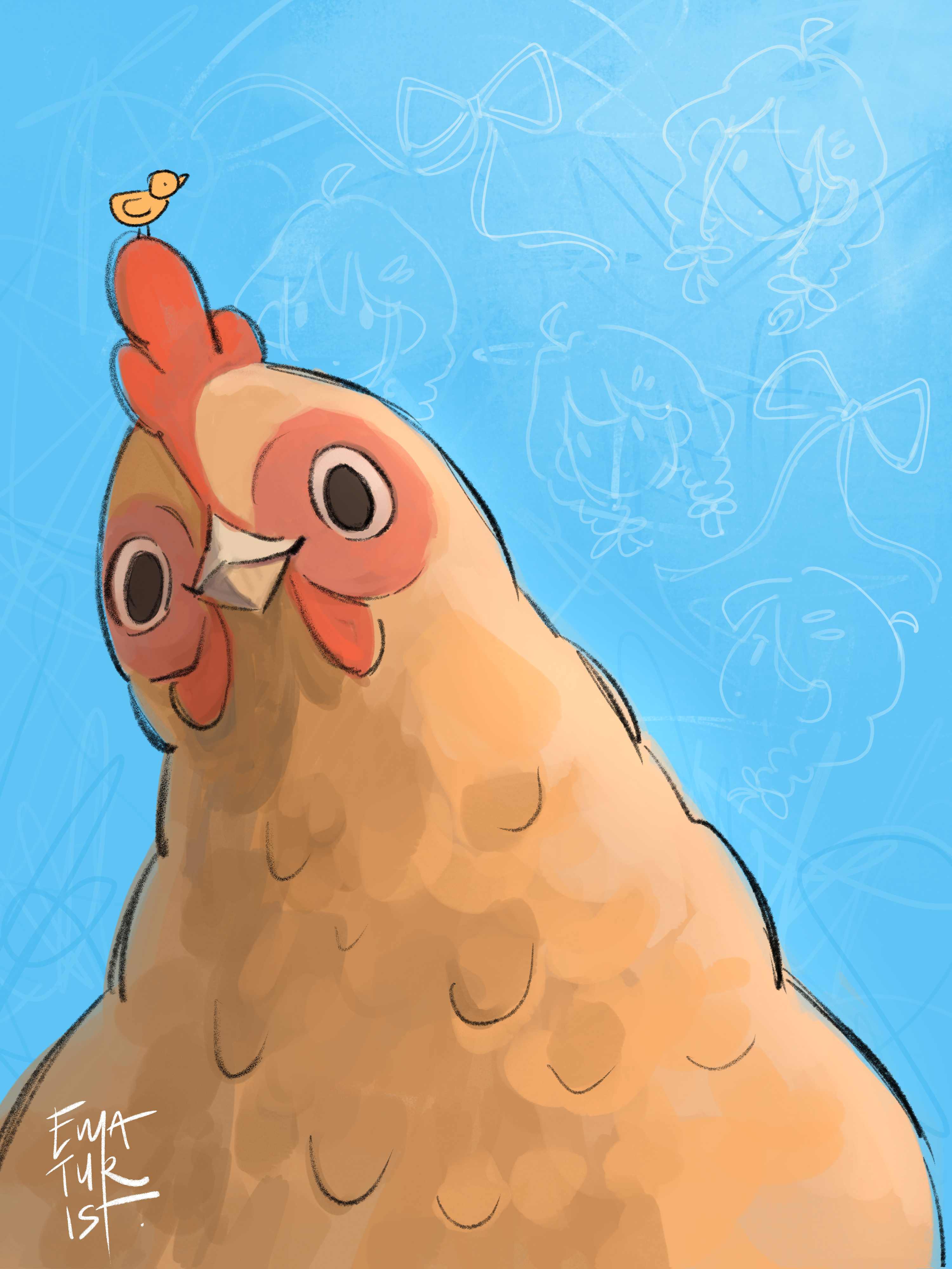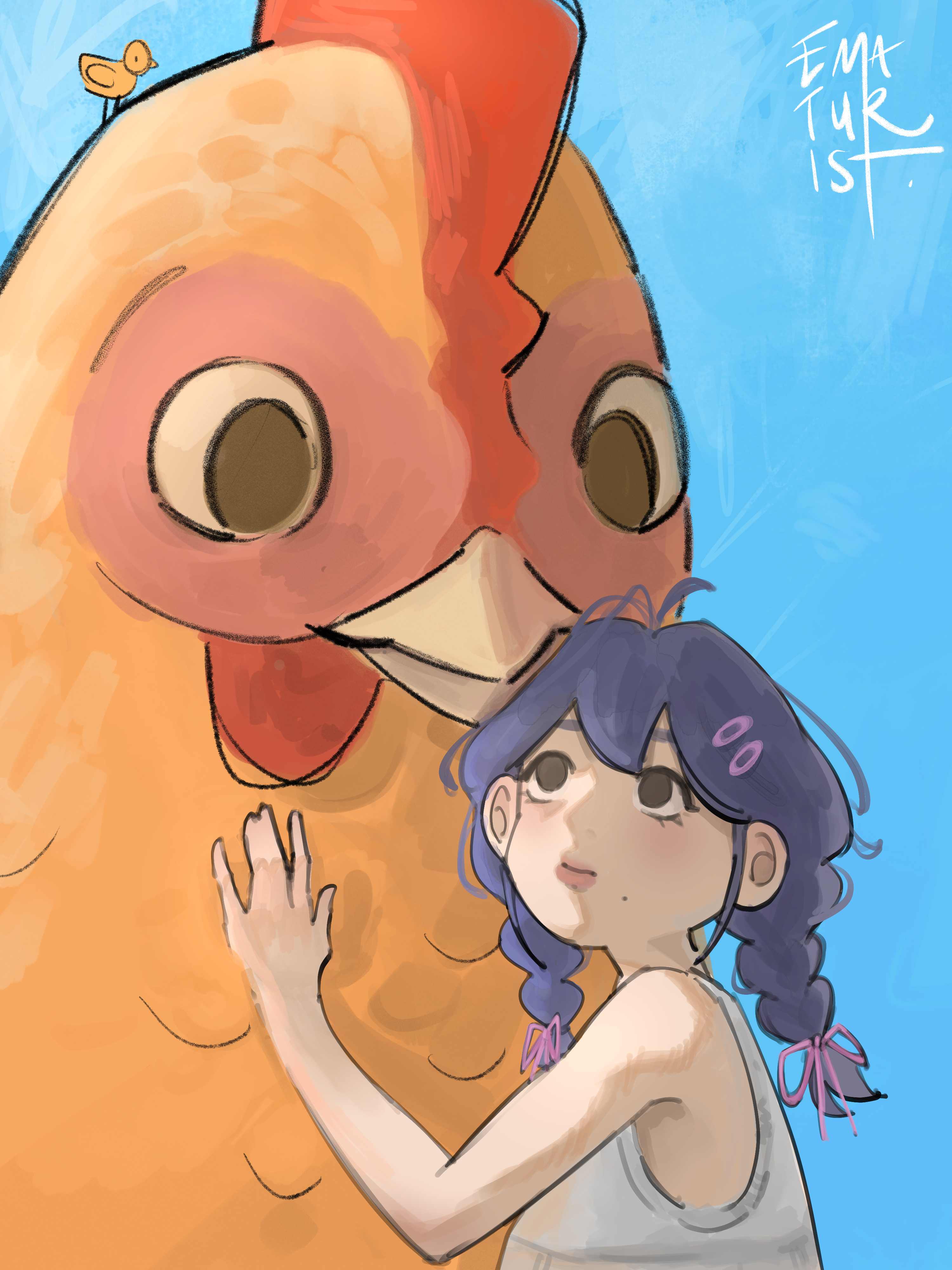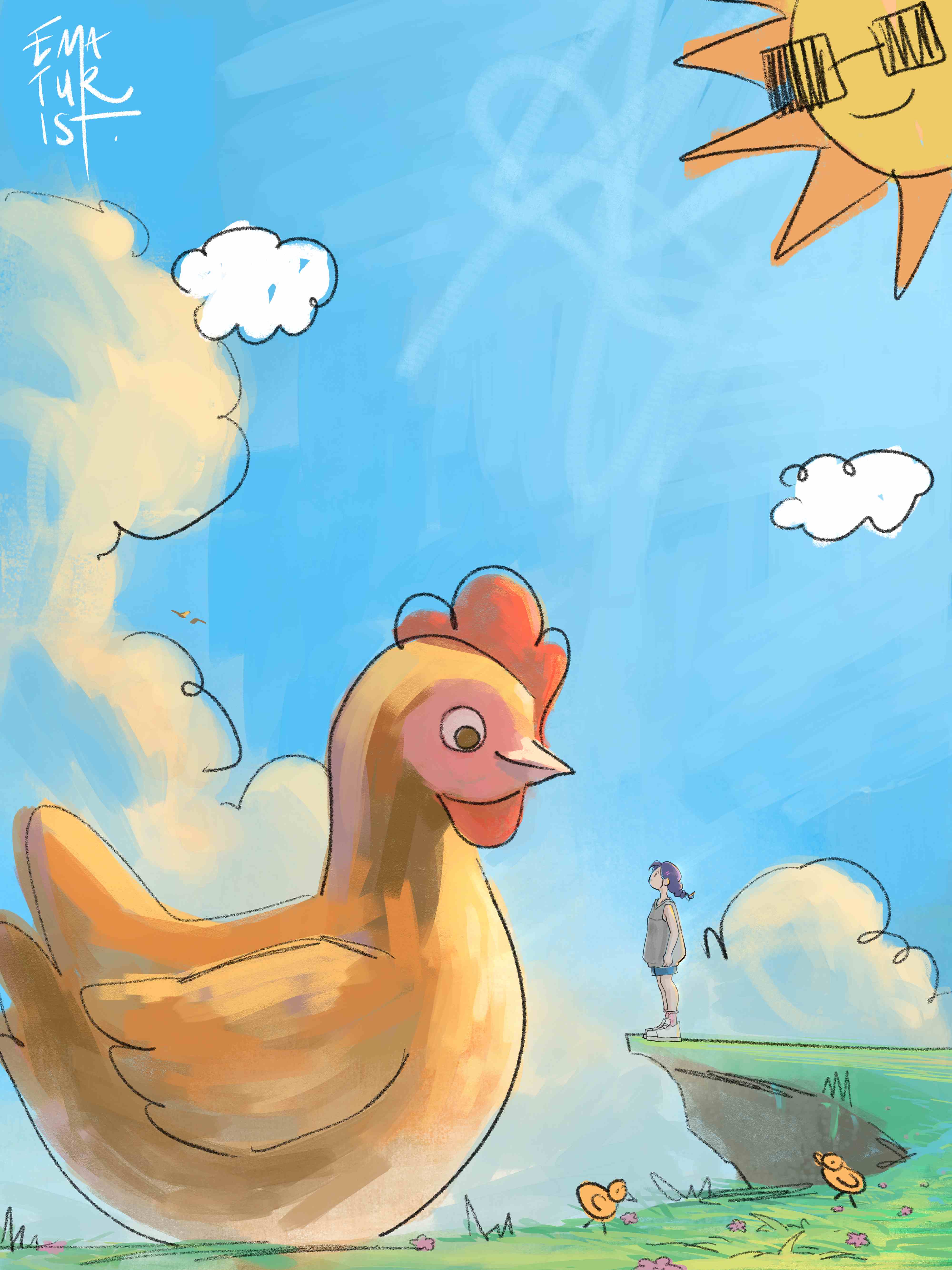 I started by researching artwork and pulling specific characteristics I loved. Then built a detailed character sheet with consistent features. Series 01 introduced the character through minimal compositions focusing purely on her design from different angles. Series 02 /"Bok-Bok" brought childhood joy to life through six sequential illustrations, exploring memories with my backyard chickens.